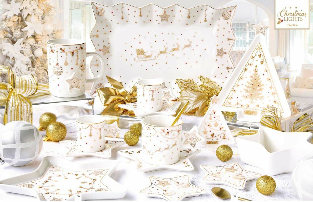 A fehér és arany kombináció elegáns színösszeállítás egy kis luxus érzéssel és csillogással. Ez a Christmas Lights karácsonyi étkészlet.