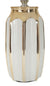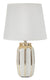 Ez a fehér-arany kerámia asztali lámpa a letisztult modern formát ötvözi a klasszikus elegancia részleteivel. A lámpatest függőleges mintázata különleges textúrát ad, az arany fényes felület pedig luxus hangulatot teremt. A fehér textil lámpaernyő lágy fényt bocsát ki, amely meghitt atmoszférát biztosít.