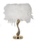 Ez a különleges asztali lámpa igazi statement darab, amely luxust és eleganciát sugároz. Az arany színű, ívelt talp modern és fényűző megjelenést kölcsönöz, míg a fehér tollas ernyő romantikus, bohém hangulatot teremt.
