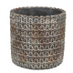 Dekoratív, szép, szürke, kör alakú kőből készült virágcserép, vidéki stílusban.