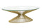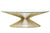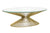 Modern és különleges megjelenésű Design ovális dohányzóasztal arany színű fém vázon, edzett üveg asztallappal.