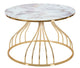 Modern megjelenésű kerek dohányzóasztal arany színű design vázzal és márvány hatású üveg lappal. Az aranyszínű fém design váz, és a fekete márvány hatású üveg asztallap elegáns kontrasztot teremt, exkluzív megjelenést biztosít a nappaliban vagy az előszobában.