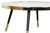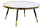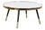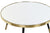 Modern megjelenésű kerek dohányzóasztal arany és fekete színű fém vázon, tükrös asztallappal.
