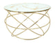 Modern megjelenésű kerek dohányzóasztal fekete és arany színekben, 2 fiókkal. Az aranyszínű fém váz, a fekete párnázott szövet borítás és a márvány hatású fa felsőrész elegáns kontrasztot teremt, exluzív megjelenést biztosít a nappaliban.