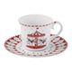 Ezt a karácsonyi porcelán eszpresszó kávés csészét fehér alapon piros és arany színű geometriai minták és egy lovas körhinta / hőlégballon díszíti, mellyel egy ünnepi vidámparkban érezheted magad.