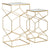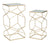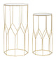Elegáns és modern kisasztal szett arany fém vázzal, amelyet különleges, geometrikus vonalak alkotnak, térhatású és egyedi megjelenést kölcsönözve. A finoman kidolgozott üveglap kifinomult fényt és eleganciát ad az asztaloknak. Praktikus és dekoratív választás nappaliba, előszobába vagy hálószobába.