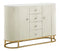 Lekerekített oldalas modern megjelenésű szekrény 2 ajtóval és 4 fiókkal. Az aranyszínű fém váz, a fekete párnázott szövet borítás és a márvány hatású fa felsőrész tiszta és elegáns kontrasztot teremt, amely bármilyen bútortípussal kombinálható.