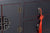 Konzolasztal, keleties stílusban, fekete, piros kiegészítőkkel, 2 fiókkal és egy ajtós szekrénnyel.