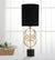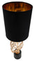 A fekete hengeres lampabúra klasszikus kontrasztot teremt az arany alapzattal, míg a fekete márvány vagy fém talp stabilizálja a konstrukciót és hangsúlyozza a monokróm elegancia érzését. A geometrikus vonalvezetés modern, art deco inspirációjú karaktert kölcsönöz a darabnak.