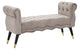 A fekete fa lábak stabilitást biztosítanak, miközben az aranyszínű fém lábtartó extra komfortot nyújt, stílusos kontrasztot teremtve. Az egyszerű, mégis letisztult dizájn lehetővé teszi, hogy könnyedén illeszkedjen bármilyen bútorhoz, legyen szó modern, vintage vagy glamour stílusról.