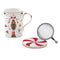 Nutcracker Twist karácsonyi porcelán bögre fém szűrővel és porcelán tetővel szett. A fehér porcelánt játékos diótörő és csíkos piros motívumok díszítik.
