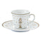 Royal nutcracker karácsonyi porcelán teás csésze aljjal, fehér alapon arany színű diótörő és ünnepi  mintákkal.