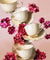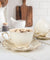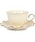 Gyönyörű krémszínű porcelán készlet arany díszítéssel. A sima csészének és az eredeti, hullámos csészealjnak köszönhetően az egész nagyon elegánsnak tűnik . A csészék díszdobozba vannak csomagolva .