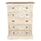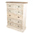 5 fiókos vintage stílusú komód szürkés-fehér színben, faragott díszekkel. Felülete kopottas, antikolt, mely a régi idők varázsát idézi fel.