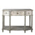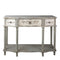 Antikolt, koptatott felületű vintage stílusú szürkés konzolasztal díszes kialakítással, faragott, elegáns lábazattal, 3 fiókkal. Stílusos és különleges bútordarab nappaliba, előszobába, irodába, folyosóra.