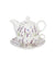 Levendulás porcelán egyszemélyes teáskészlet szűrővel díszdobozban, mely tartalmaz egy kis teáskannát, fém szűrőt, egy porcelán csészét és a hozzá tartozó aljat.